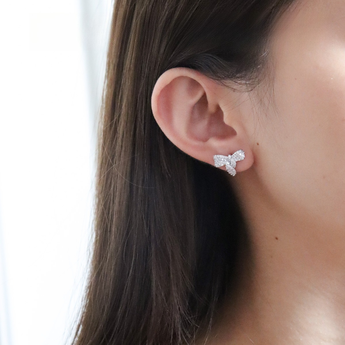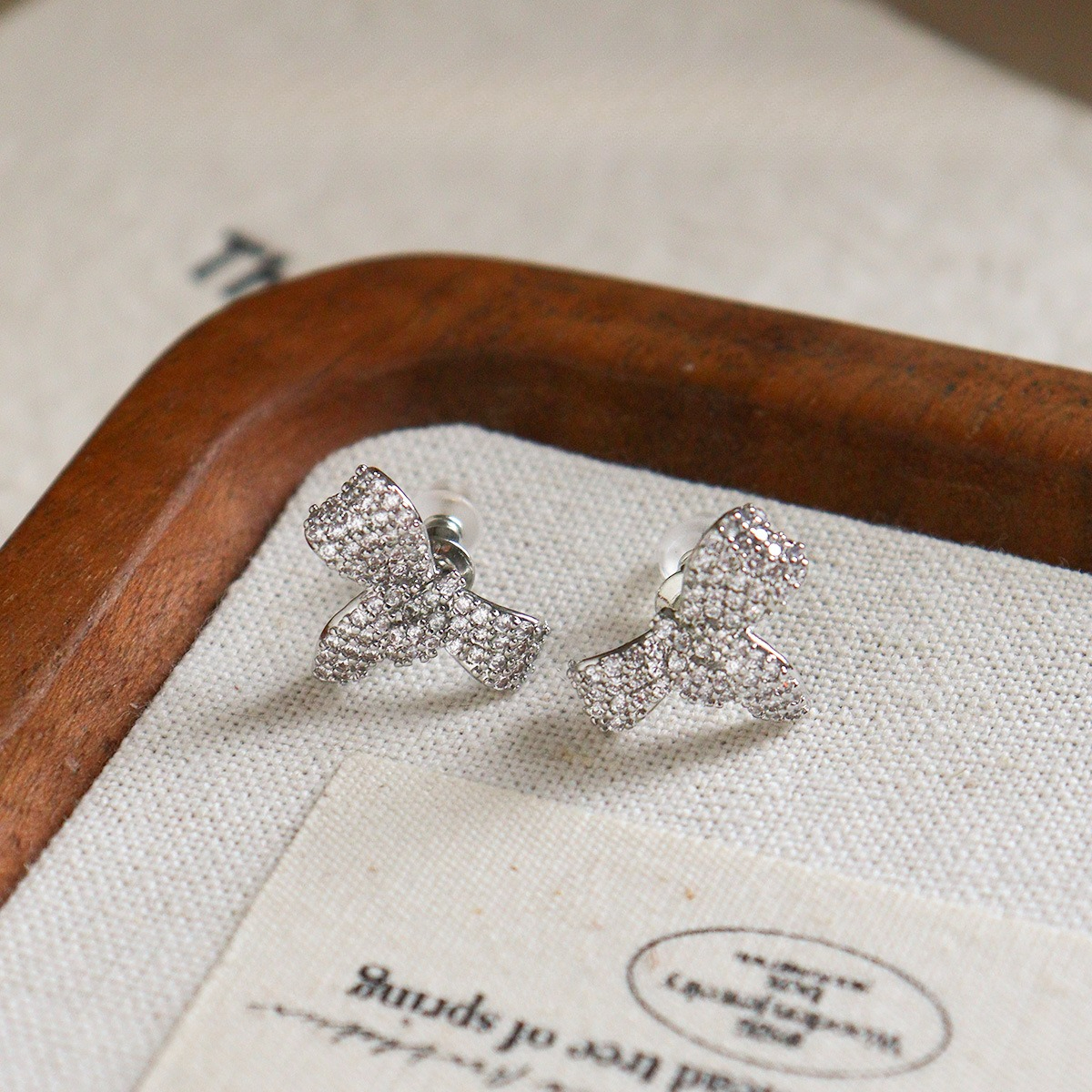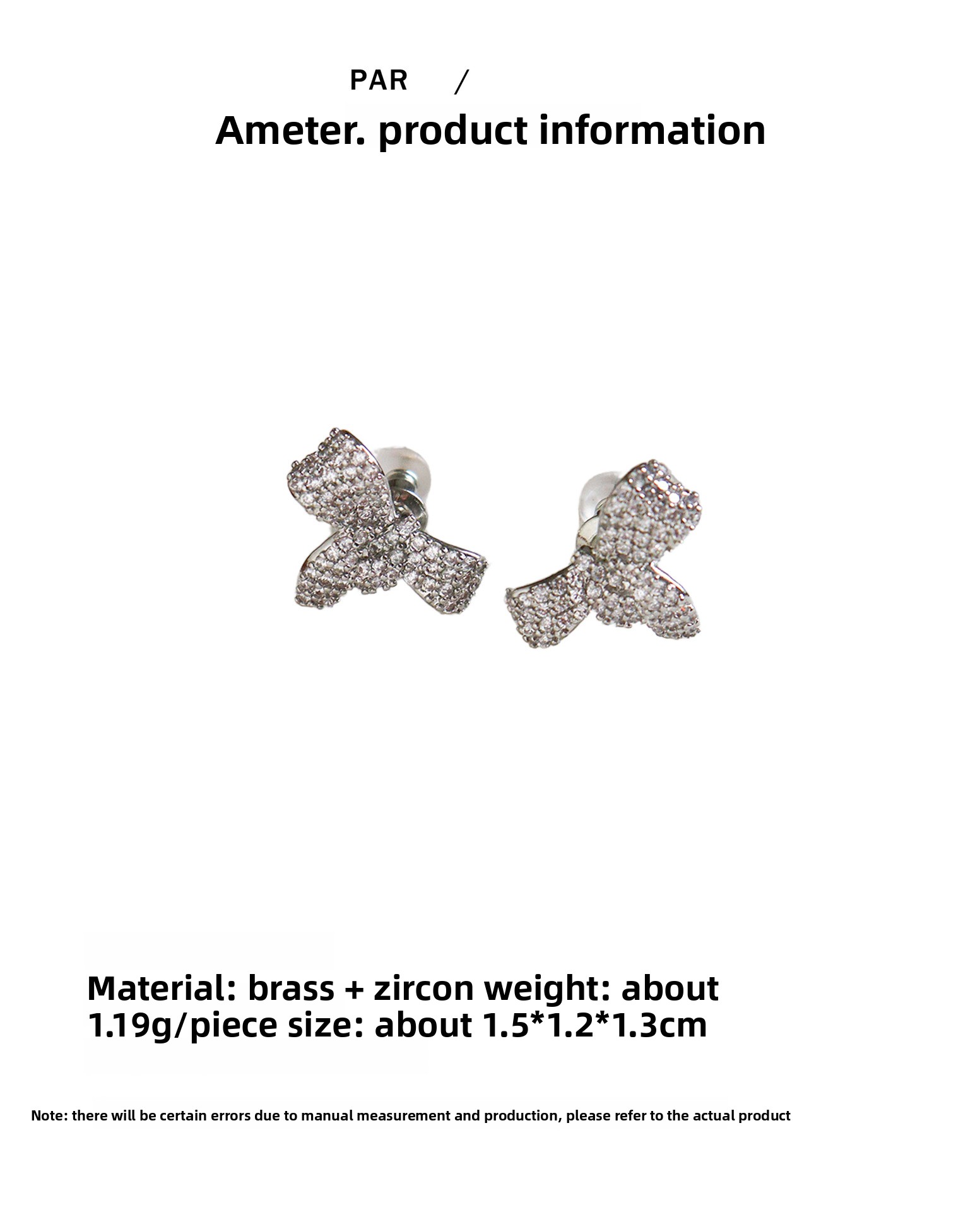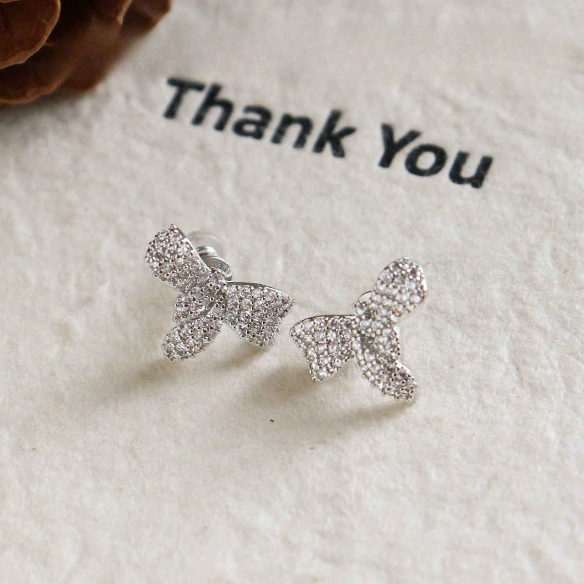 Delicate micro-inlaid zircon bow stud earrings, high-end silver needle earrings.