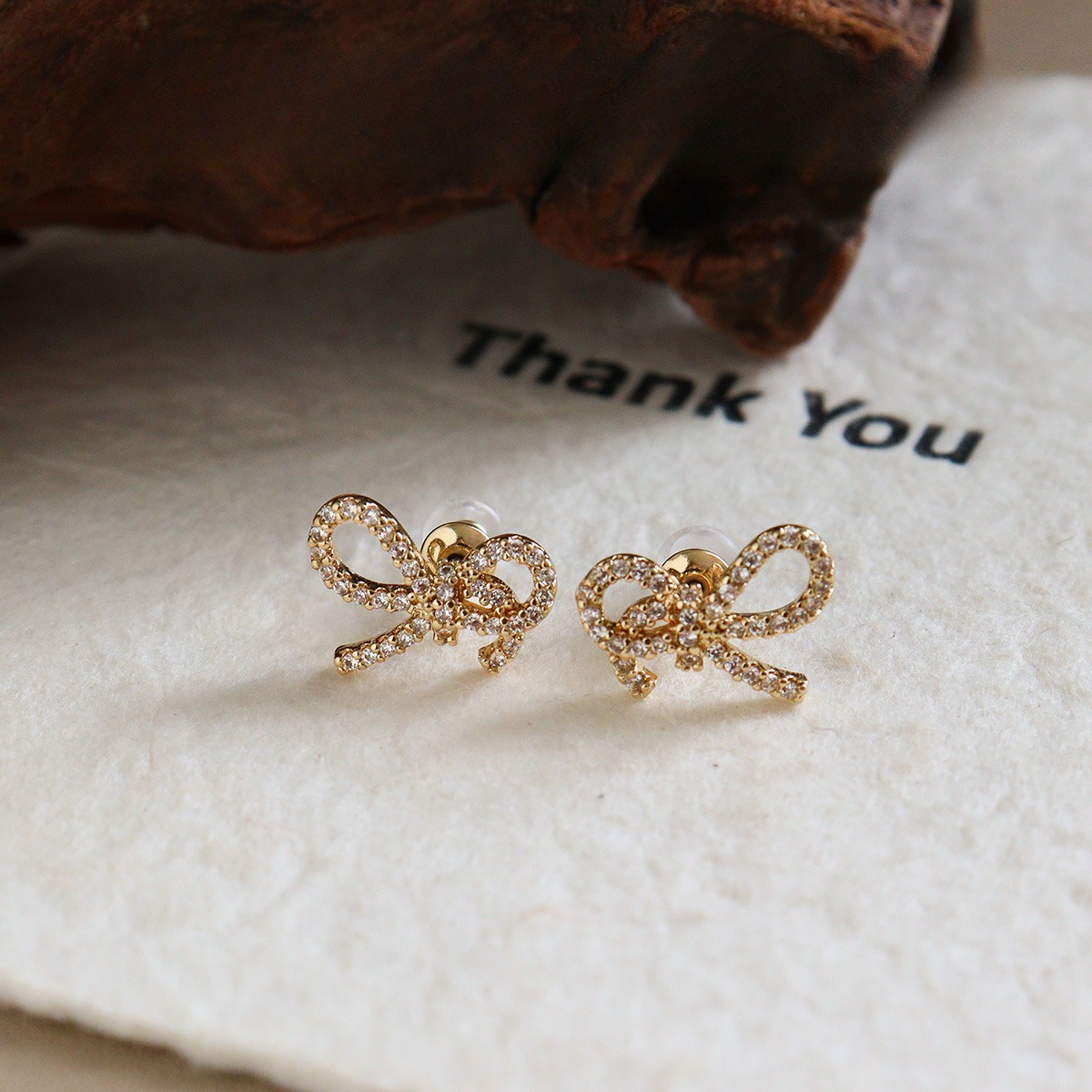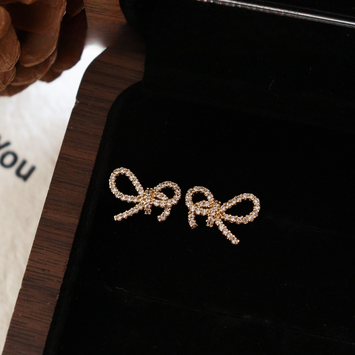 Stylish, simple and elegant, micro-inlaid zircon bow stud earrings, niche high-end silver needles