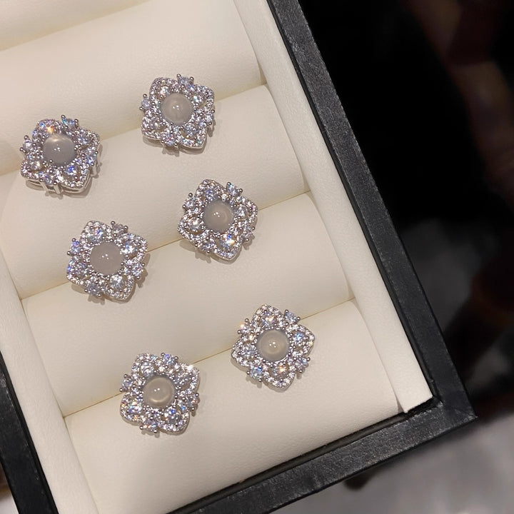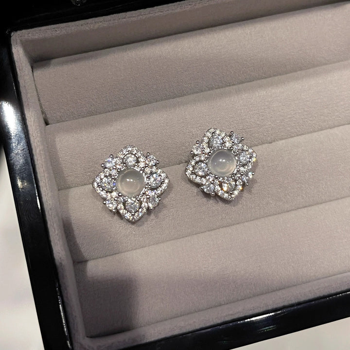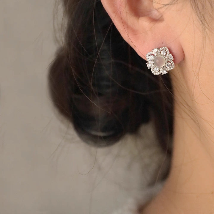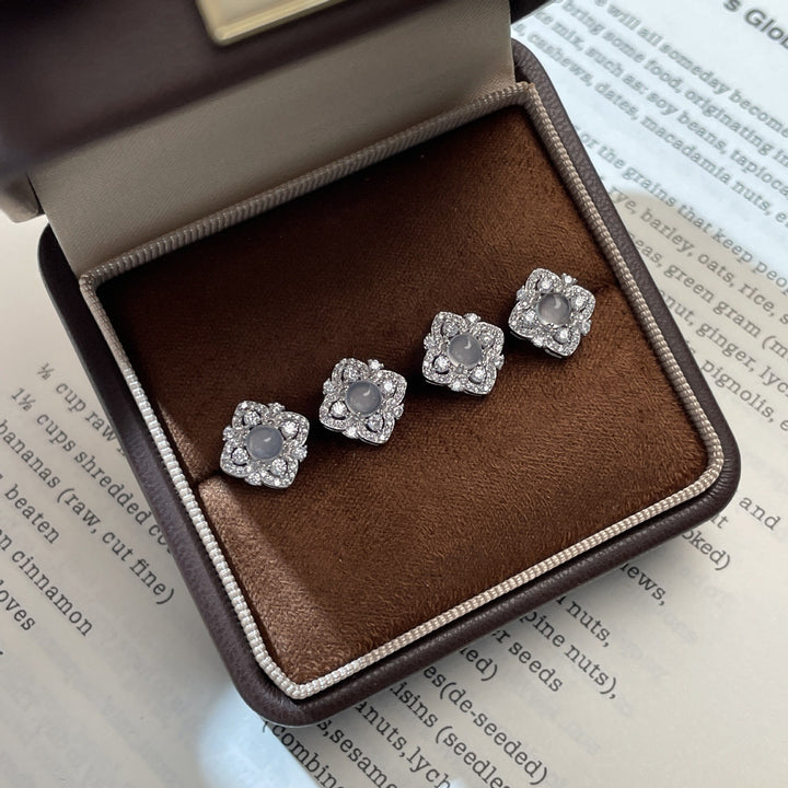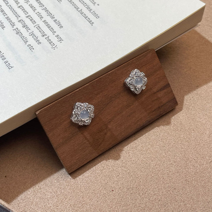 French retro natural chalcedony flower stud earrings S925 four-leaf clover
